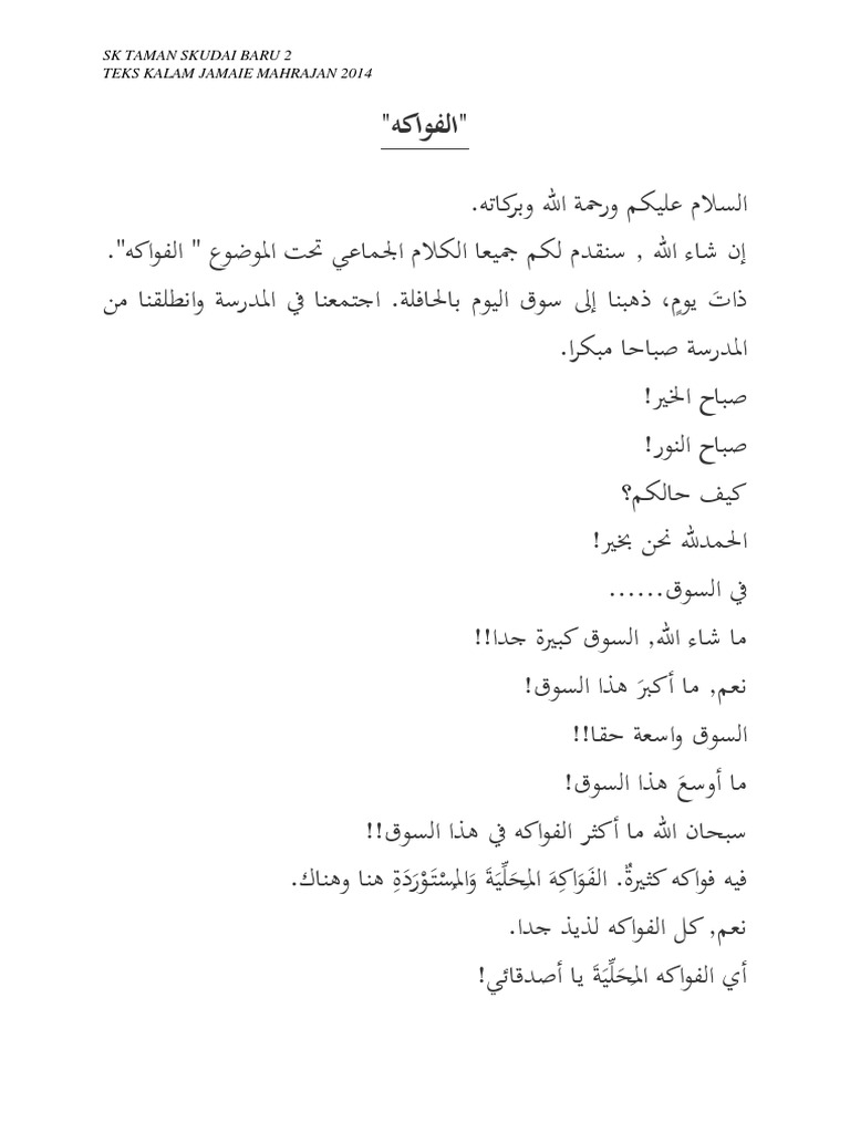 You can create one as well, really easily.get started. Alif lam qomaria dan syamsiyah 2. Contoh teks kalam jamaie bahasa arab كلام جماعي ا. Kalam jamaie merupakan choral speaking tetapi menggunakan bahasa arab. Contoh teks kalam jamaie bahasa arab كلام جماعي ا. Contoh teks temuduga bahasa arab المقابلة الشخصية. Contoh teks mc bahasa jawa singkat. Bahan untuk aktiviti kem solat 2. Untuk memuat turun buku teks bahasa arab tahun 2 kssr semakan kegunaan 2018, sila klik pautan yang tertera di bawah : Motivasi ustadz nuzul dzikri untuk belajar bahasa arab. Bahasa arab bisa dikatakan sudah menjadi kebutuhan primer karena semua sumber ilmu agama dan praktek ibadah mayoritas orang penelitian ini bertujuan untuk mengungkap kesepadanan penerjemahan polisemi dari bahasa arab ke dalam bahasa indonesia. Kalam jamaiكلام جماعي by iium 6734 views. Teks kalam jamaie sk yan kechil.