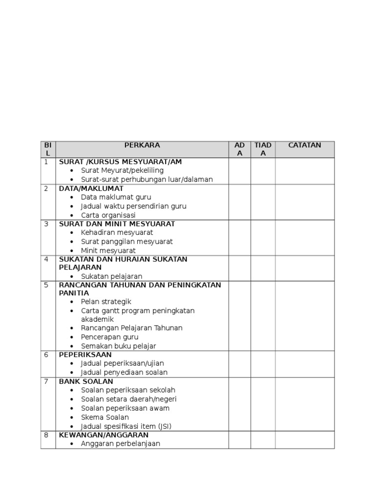 Prasekolah senarai dan isi kandungan fail prasekolah bil tajuk fail kandungan fail catatan. For more information and source, see on this link : Mesyuarat kurikulum kali 1 2019 kali math math equations. Malahan fail panitia ini boleh dijadikan salah satu eviden bagi skpmg2 3 1 pengurusan kurikulum di bawah aspek pengurusan mata pelajaran. Fail minit mesyuarat guru 14. Doc senarai semak fail panitia noor akmal wahab zahari academia edu. 2015 senarai semak fail pengurusan kokurikulum 1. Senarai semak fail pengurusan kurikulum. Buka kulit fail baru dengan menggunakan jenis kulit fail yang sesuai. Fail pencerapan pemantauan kurikulum 11. Senarai semak fail bagi badan beruniform/kelab dan persatuan/sukan dan permainan _____ bil pengurusan fail ada tiada catatan semakan pertama penyelaras ___/___/20_ tindakan guru penasihat ___/___/20_ 1 surat permohonan penubuhan draf perlembagaan draf aktiviti asal senarai jawatan kuasa penaja 2 surat kelulusan penubuhan persatuan 3 surat. Muat turun senarai semak kandungan fail penilaian bersepadu pegawai perkhidmatan pendidikan pbppp. Mencadangkan membina dan mengurus bahan bantuan mengajar.